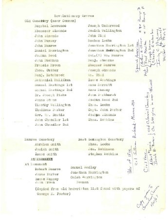 - List titled "Revolutionary Graves," compiled by Louis Cheever, May 1967. Includes graves in the Old Cemetery (a.k.a. the Old Burying Ground), in Munroe Cemetery, at the monument on the Common, in Westview Cemetery, and in Munroe Cemetery. Handwritten... View Full Record