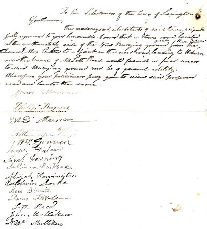 - Petition of Jonas Munroe and others to Selectmen, requesting a new road on the northwest side of "the new Burying Ground," no date