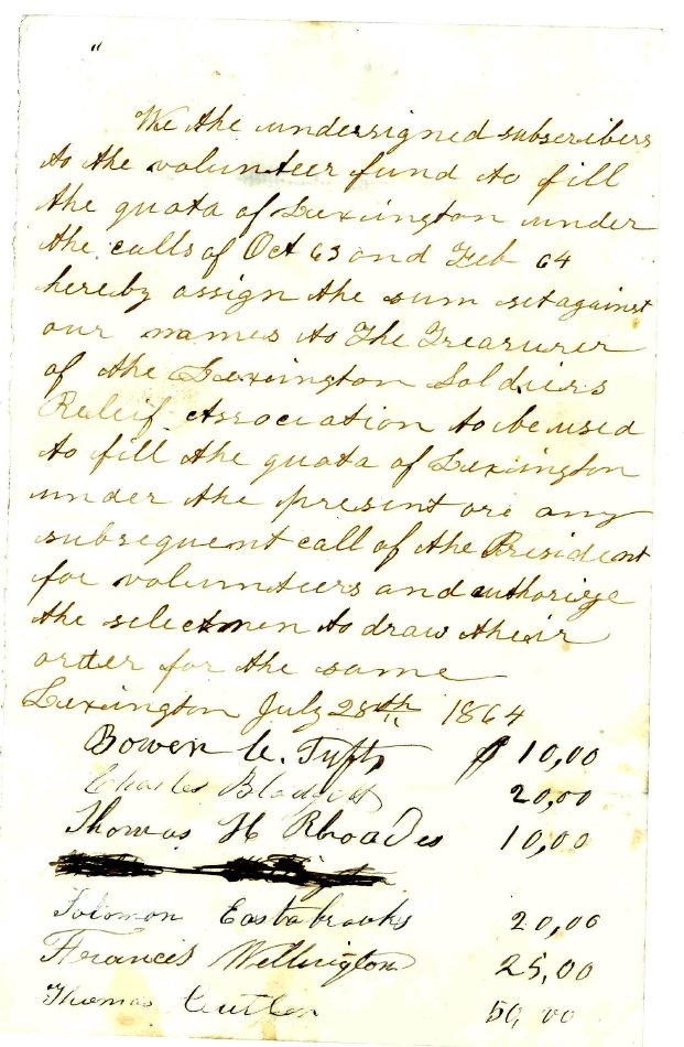 List of subscribers to the volunteer fund to fill the quota of Lexington under the calls of October 1863 and February 1864, circa 1864
