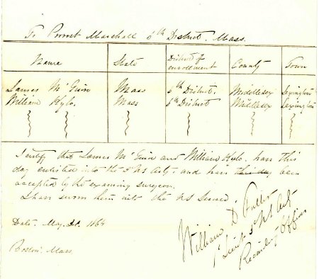 - Certificate of enlistment of James McGuin and William Kylo, May 21, 1864