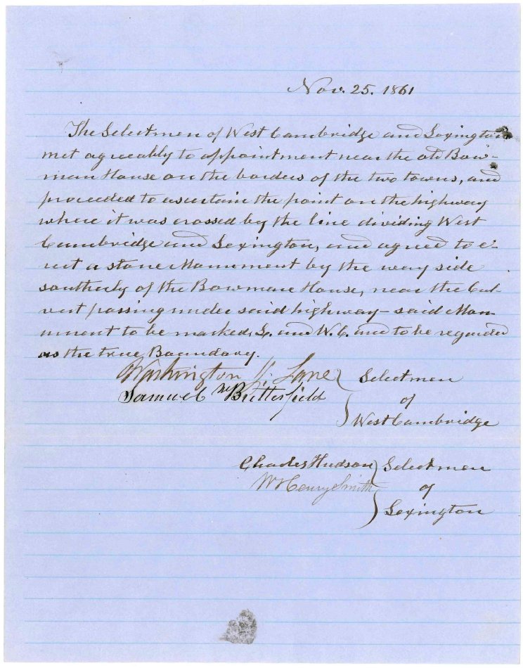 Report concerning the placement of a monument to mark the boundary between Lexington & West Cambridge, November 25, 1861