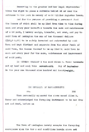 Deed (unsigned draft), Ellen M. Tower to Town of Lexington, land for Tower Park, September 17, 1928